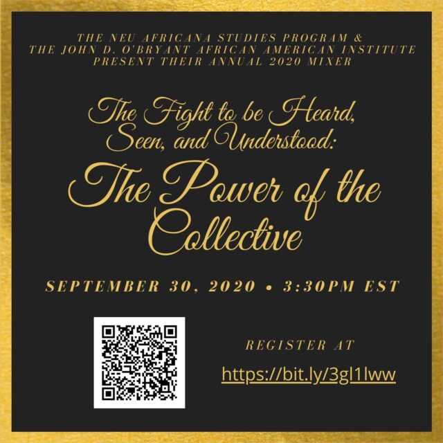 The Africana Studies Program and the John. D. O’Bryant African American Institute present their annual 2020 mixer as a continuation of our series “The Fight to be Heard, Seen, and Understood.” The mixer was inspired by a Town Hall the Institute held for Black students where they expressed they wanted more opportunities to meet Black faculty and Staff on campus. This year, the theme of the mixer is The Power of the Collective – we will have representatives from undergraduate student organizations, graduate students, staff, and faculty of color speak, share Africana-inspired libations, and share resources and stories with one another.