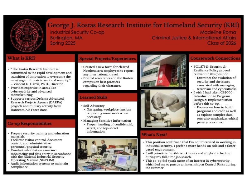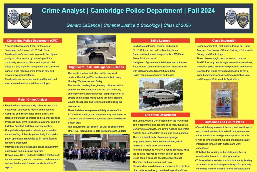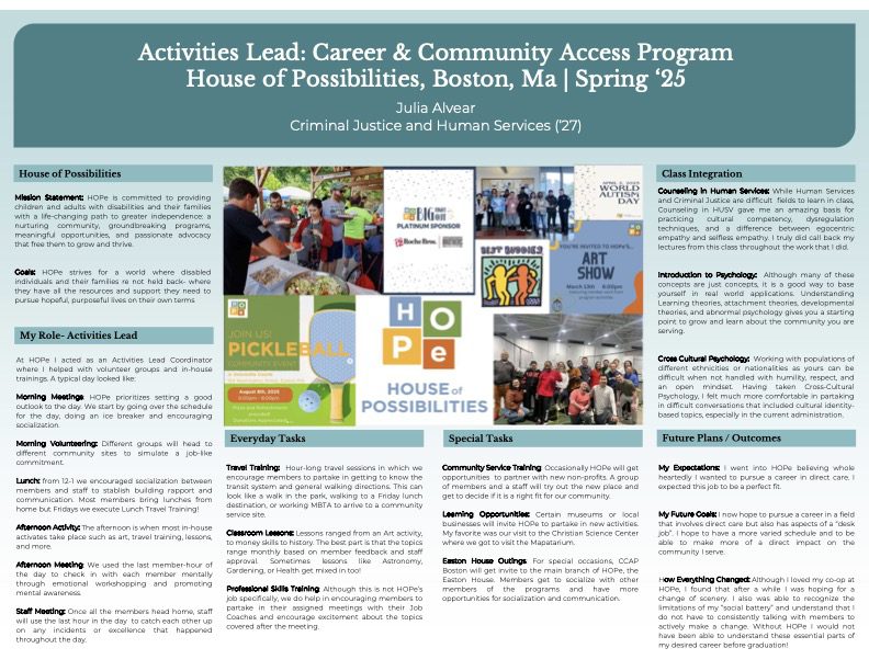 Students returning from co-op participate in informal poster presentation sessions addressed to faculty and friends. Creating posters helps students articulate their individual takeaways from each experience including broad goals, daily responsibilities, special focus projects, learning outcomes, classroom integration, and future direction.